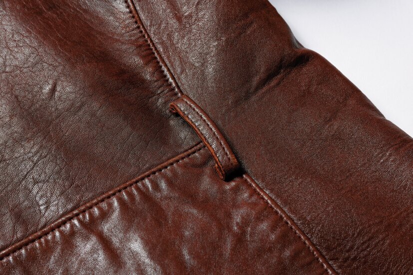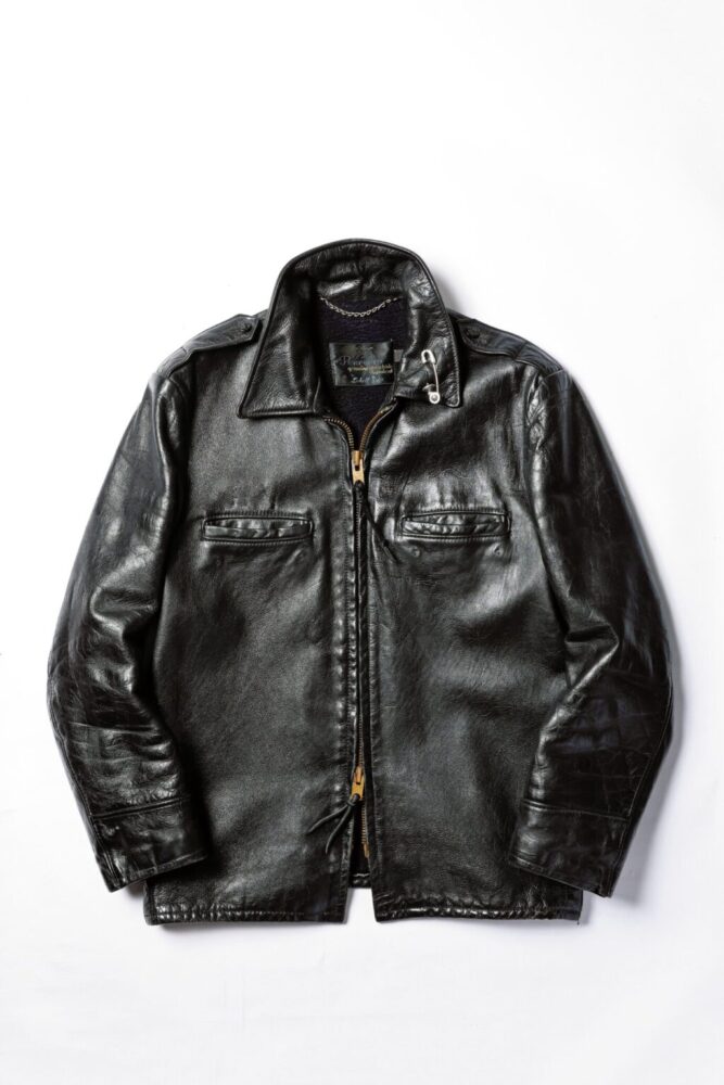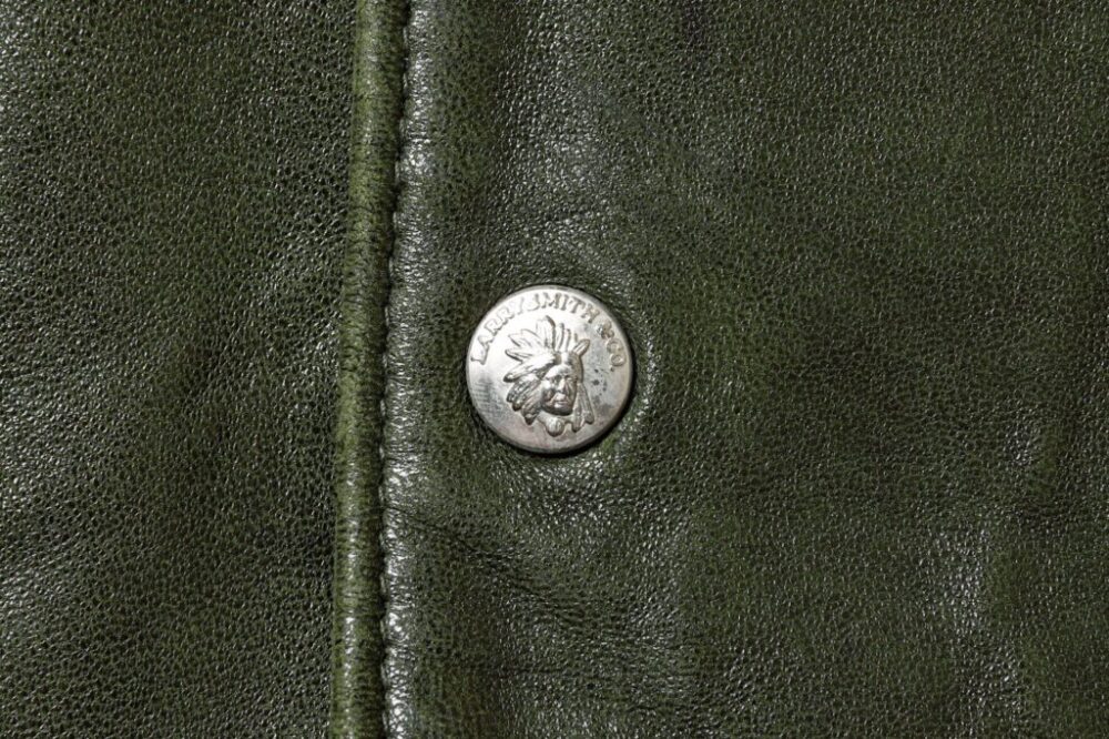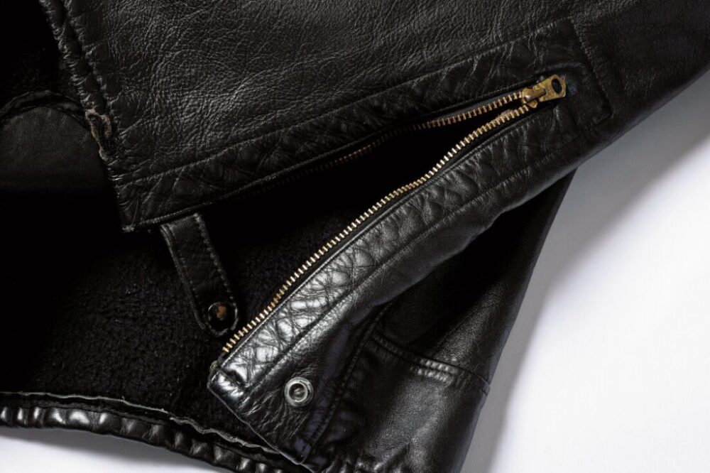 1957年に発売されたルイスレザーズの隠れた名作ブラックアローに、大きなワンオフのピンズでカスタム。シープスキンの仕様だ。