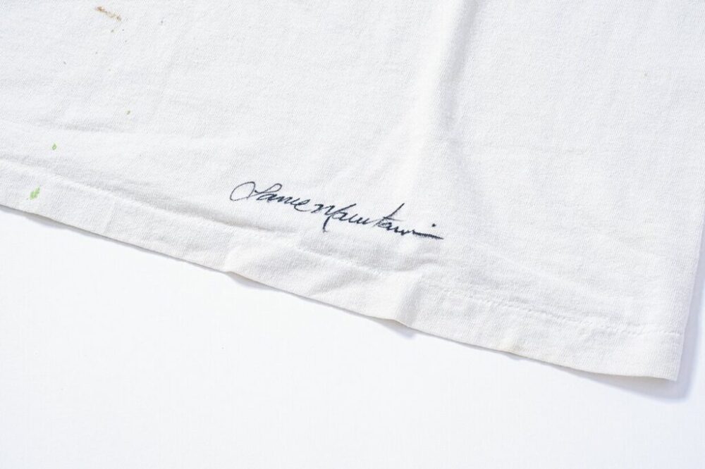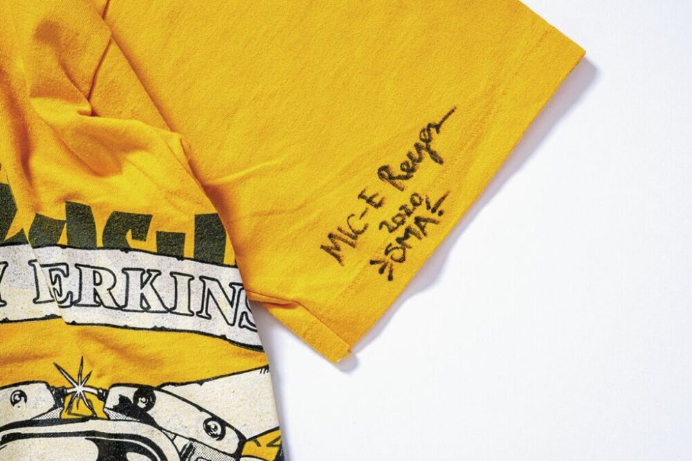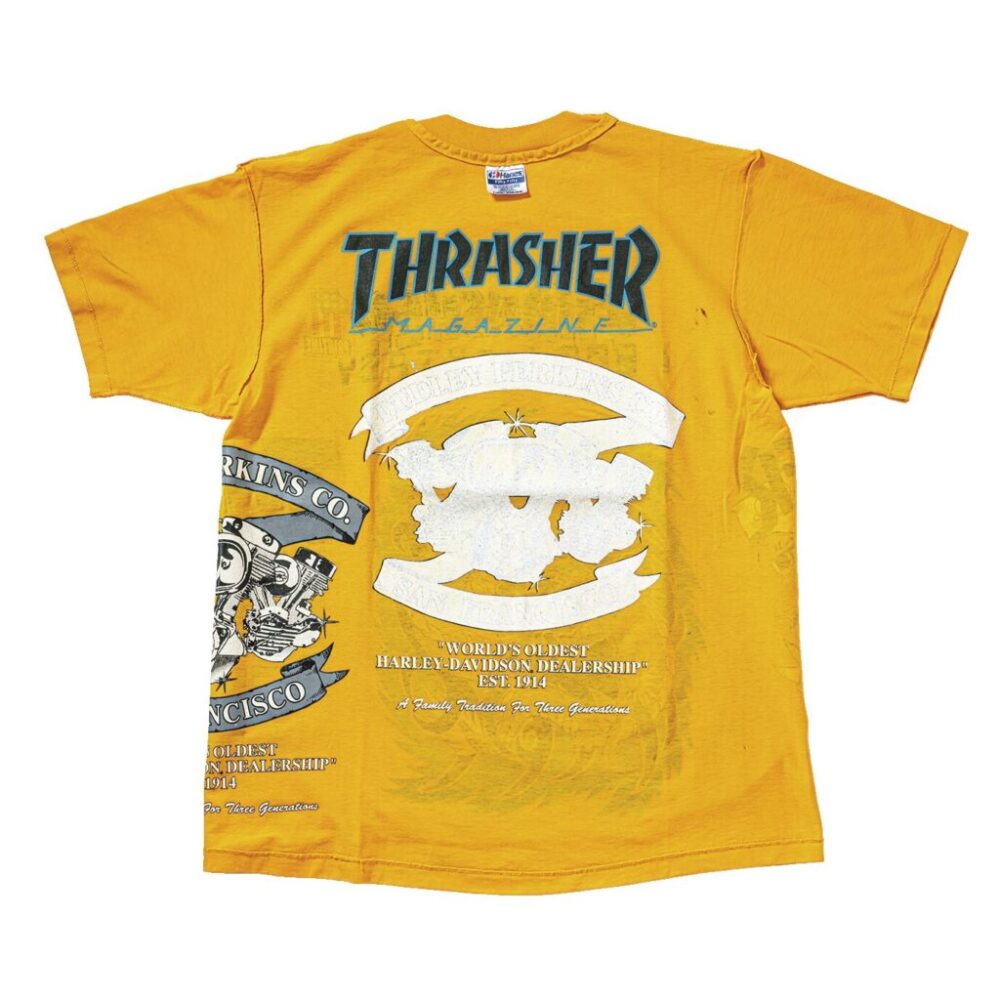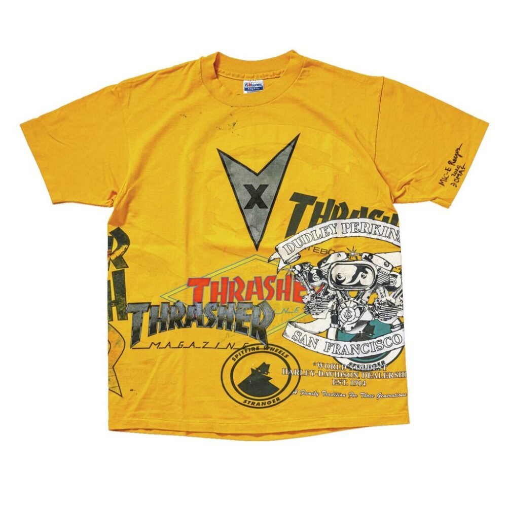 THRASHERマガジン系列のプリント工場にてテストプリントで使って捨てられていたものを、当時現場に出入りしていたプロスケーターのミッキー・レイズが拾い、取っておいたTシャツ。それを本人の直筆サイン入りで櫻井さんが直接買い取った一着。まるでリバーシブルのような両面プリントがインパクト絶大。