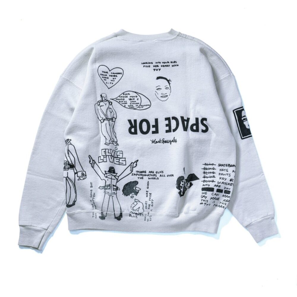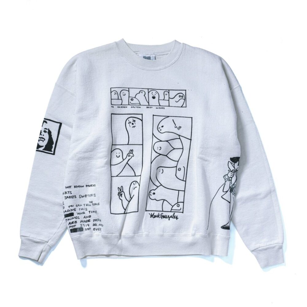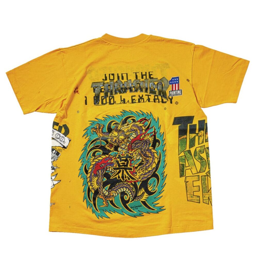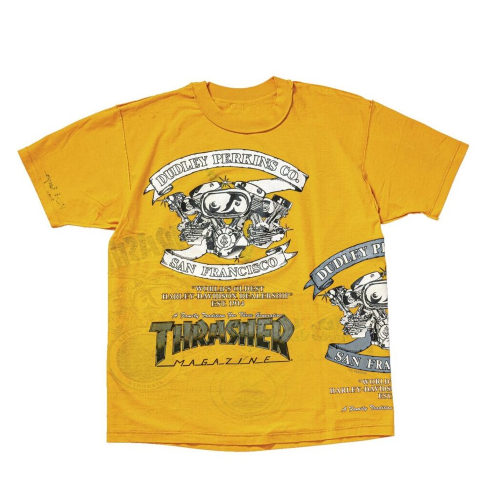 THRASHERマガジン系列のプリント工場にてテストプリントで使って捨てられていたものを、当時現場に出入りしていたプロスケーターのミッキー・レイズが拾い、取っておいたTシャツ。それを本人の直筆サイン入りで櫻井さんが直接買い取った一着。まるでリバーシブルのような両面プリントがインパクト絶大。