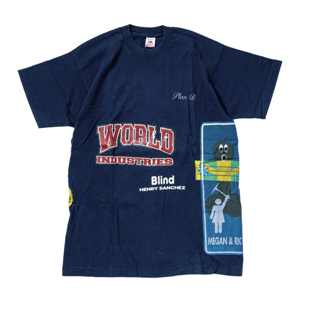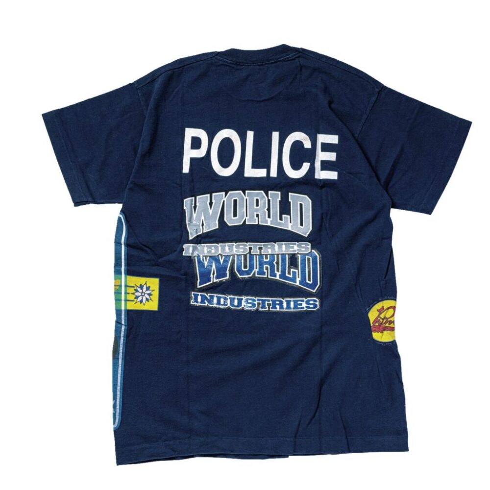 World Industries、PLAN B、Blind、Bitch、Prime のワールド系列ブランドを一挙にプリント。工場スタッフがテストプリントで作ったものが市場に流通してしまったのだが、複数枚あるのは確認できている。POLICEの文字は謎。
