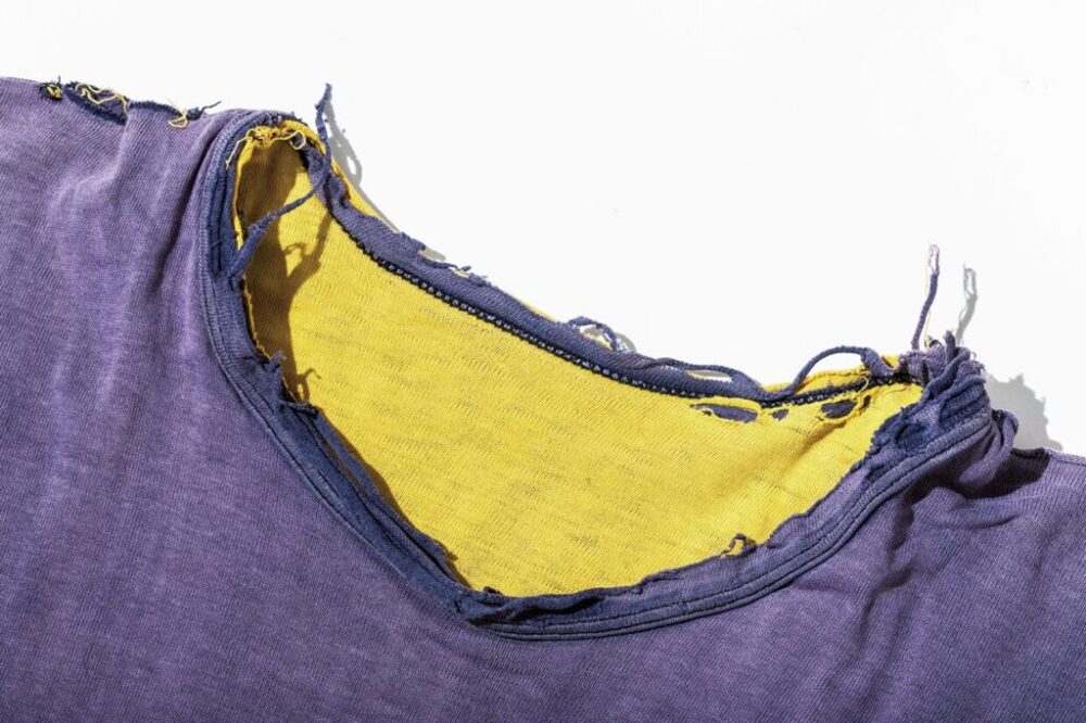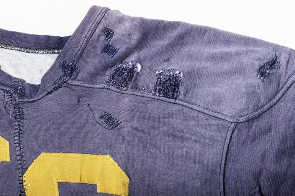 SAND KNITというメーカーのフットボールTシャツは、茄子紺にエイジングされたカラーリングと、随所のダメージが個性的だ。