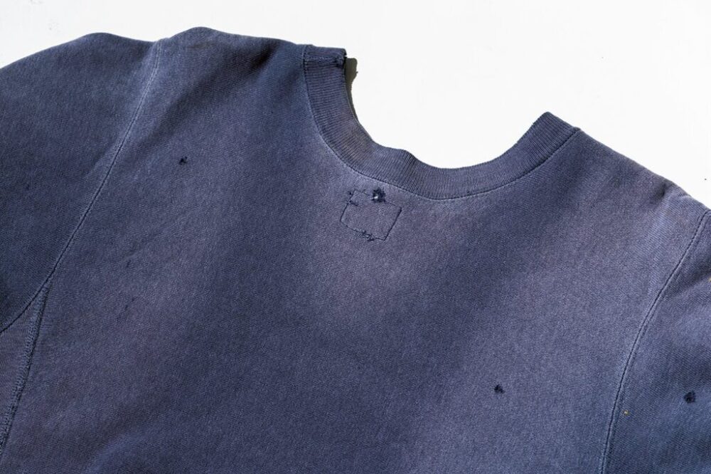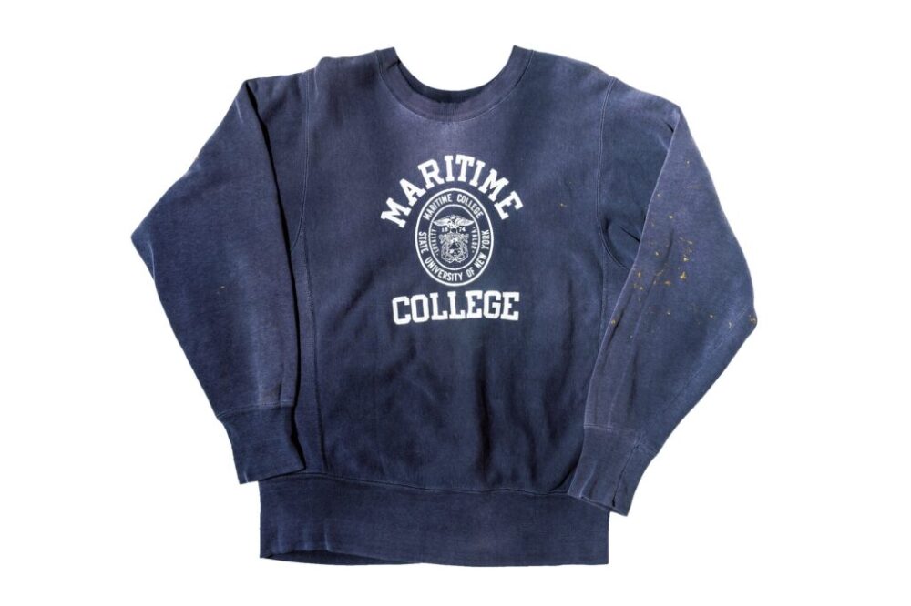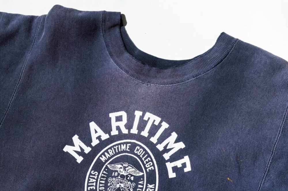 いい感じに褪色したネイビーのチャンピオンのリバースウィーブは、タタキタグと思われる。ニューヨークにある海事大学のオリジナルで、プリントのデザインも◎。14万3000円