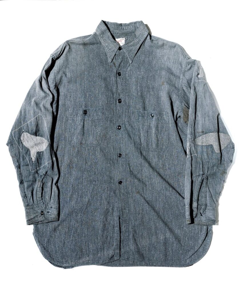 随所にリペアの入ったブラックシャンブレーのワークシャツは、オックスハイド。生地的に’50年代のもので間違いない。6万6000円