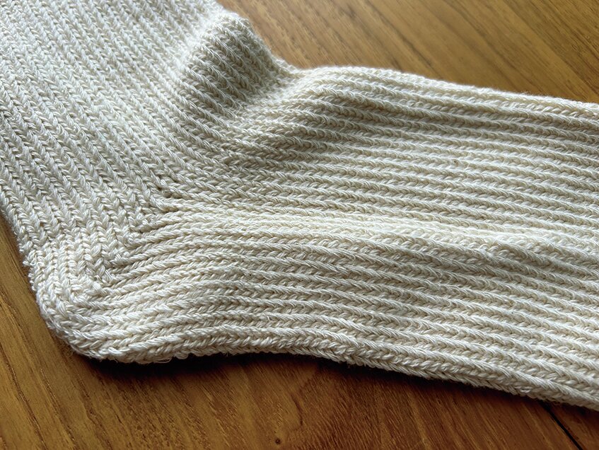 靴下の白い部分にデニムの残糸が使われている。ふんわりとした肌触りに編み込んでいるため、包み込まれるような感覚だ。伸びがよいため、自分の足に自然と合う。