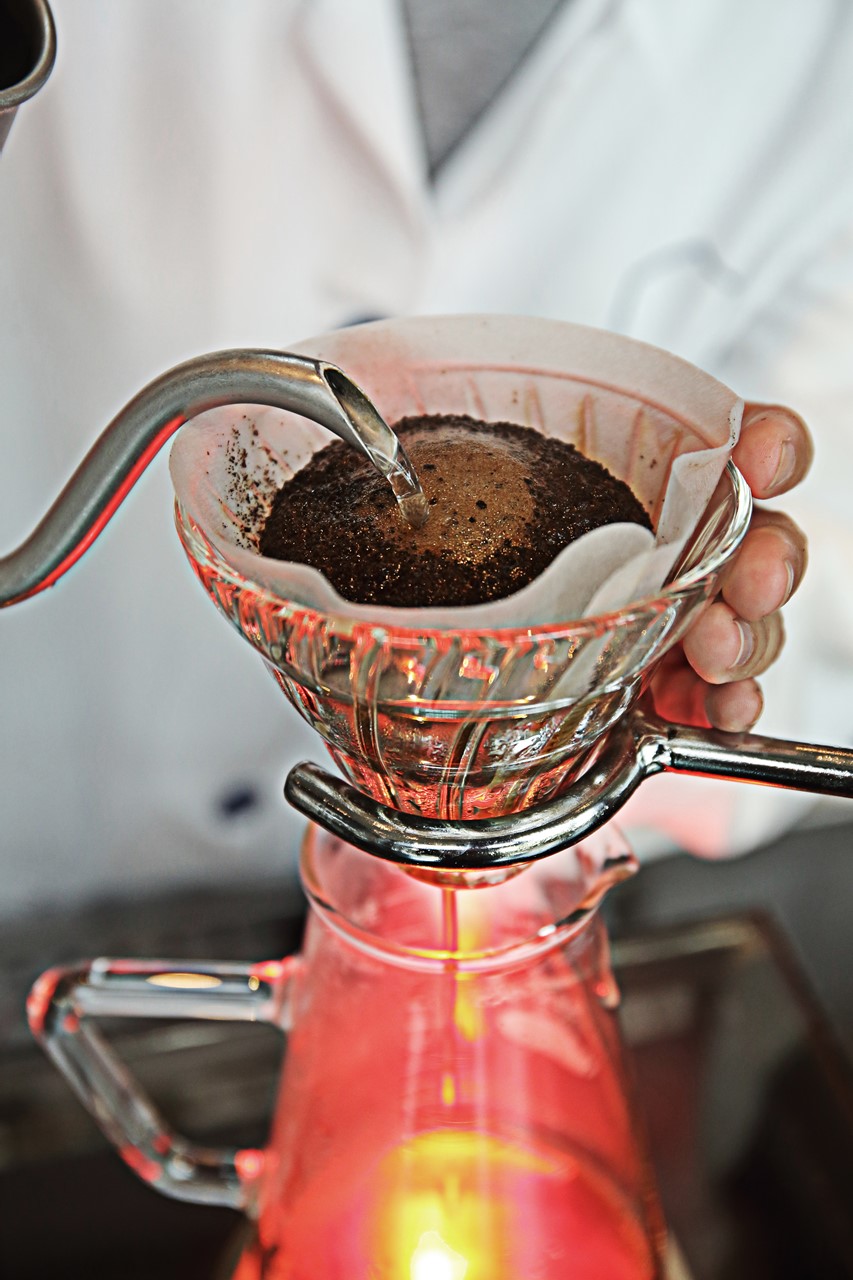 焙煎された豆はハリオV-60で抽出されお客さまのもとへ。感覚ではなくすべてが理論付けられた抽出方法で豆のポテンシャルを引き出している。