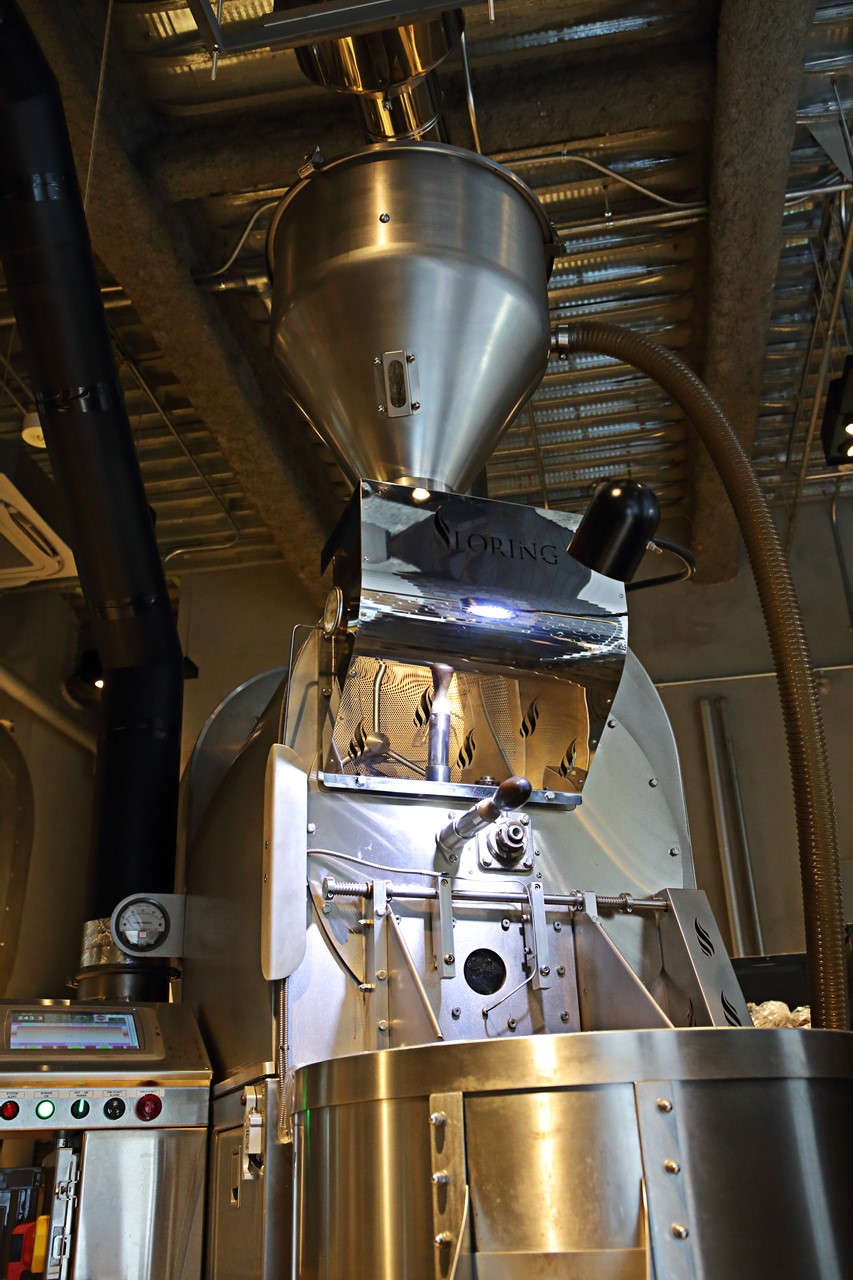 猿田彦珈琲の初号機であるローリング35kg釜。ブレンド豆を焼くときに活躍することが多い。透明感のある豆に仕上がる。