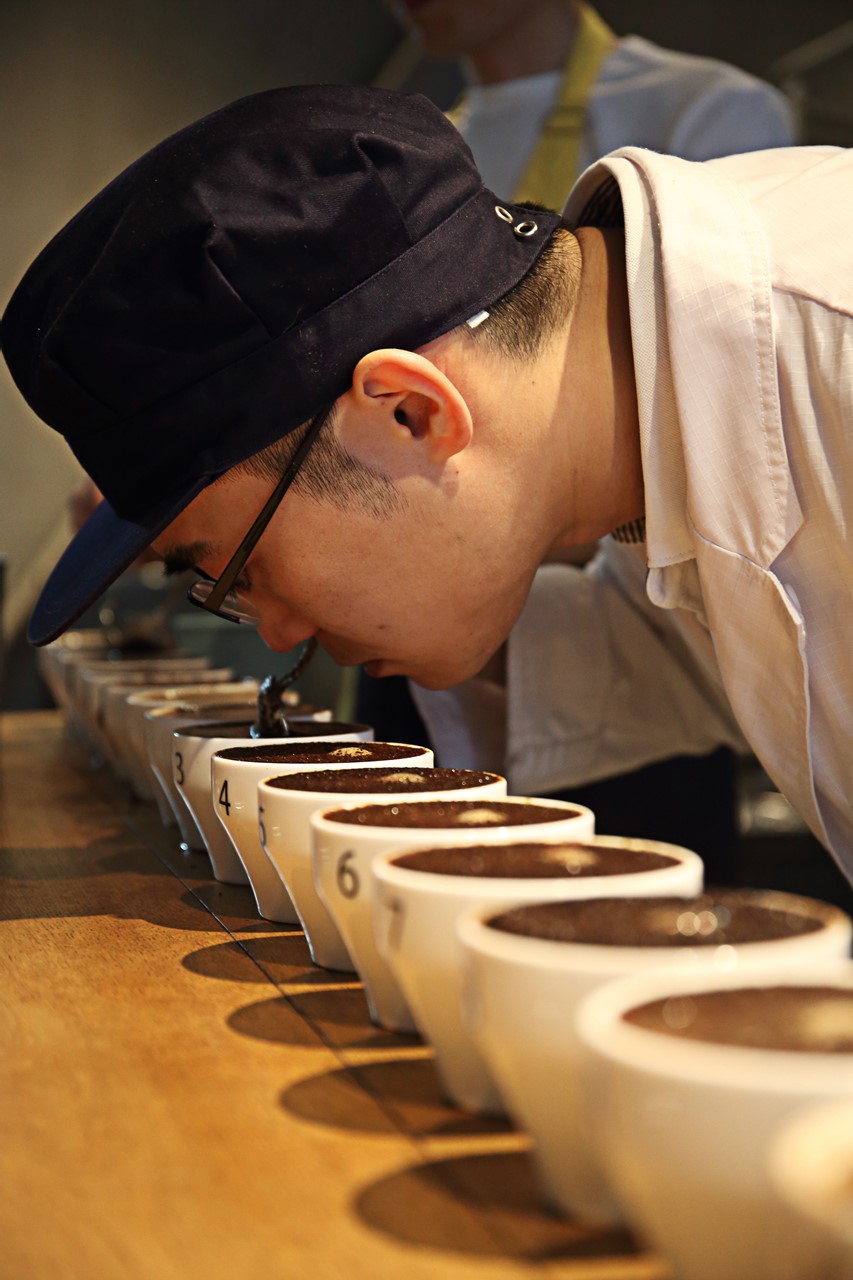 カッピングで風味を何度も確認。カッピングスプーンでコーヒーをすくいテイスティング。美味しいコーヒーを届けるための大事な工程だ。