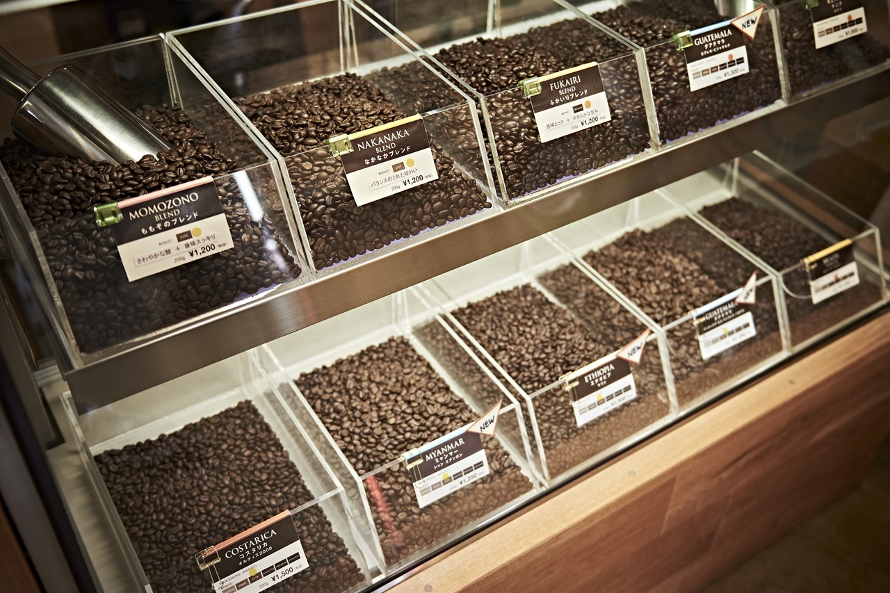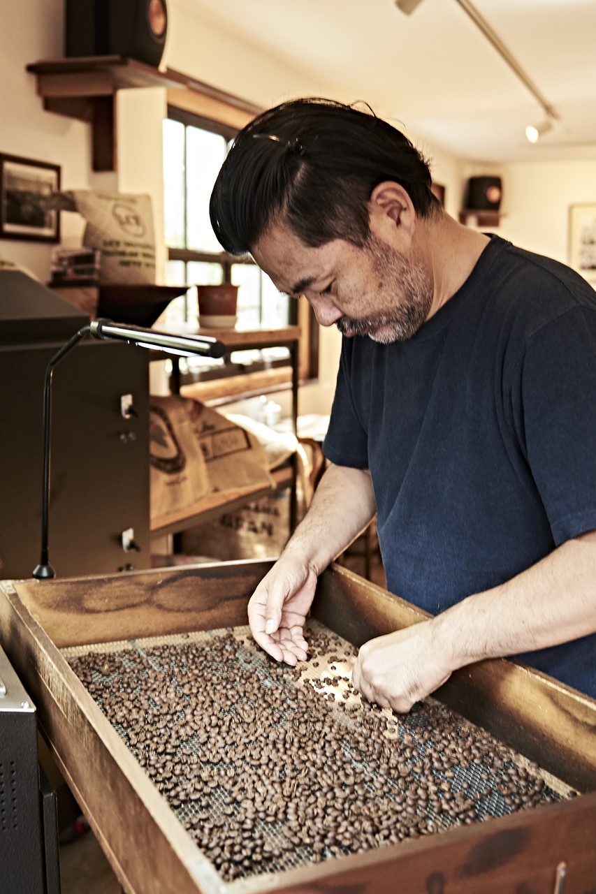 焙煎前と後はハンドピックを行い店頭で販売する。まさにお手本ともいうべき丁寧な仕事ぶりこそが武藤さんの流儀である。また無垢の木材を基調とした店内には、KEFのスピーカーなど、武藤さんこだわりの音響もさりげなく設置される。