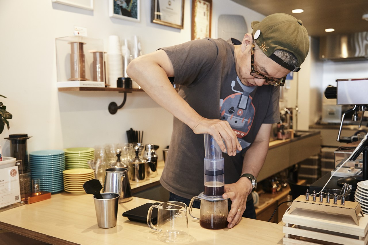 「私のお店は豆本来の味が最も感じられるフルーティーな浅煎りの豆のみを扱っているお店ですが、エアロプレスとの相性がバツグンなのです。それはコーヒーの良い成分のみが強調されて抽出されるから。比較的安定して誰でもかれでも気軽にコーヒーが淹れられるエアロプレスは私のお気に入りなのです」