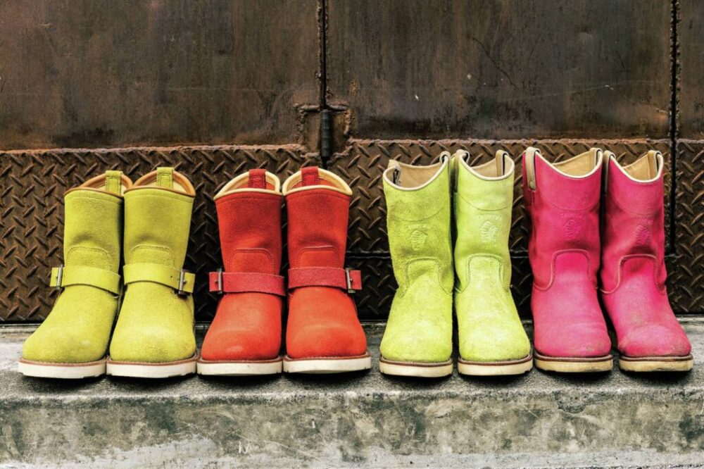 派手な蛍光色のオリジナルレザーを用いたペコジニアブーツは、右2つの90年代のチペワ×クイックシルバーのローパーブーツからインスパイアされている。当時のものは顔料染めであるが、キーストーンは染料の芯染めで発色の良さを表現。各6万3800円