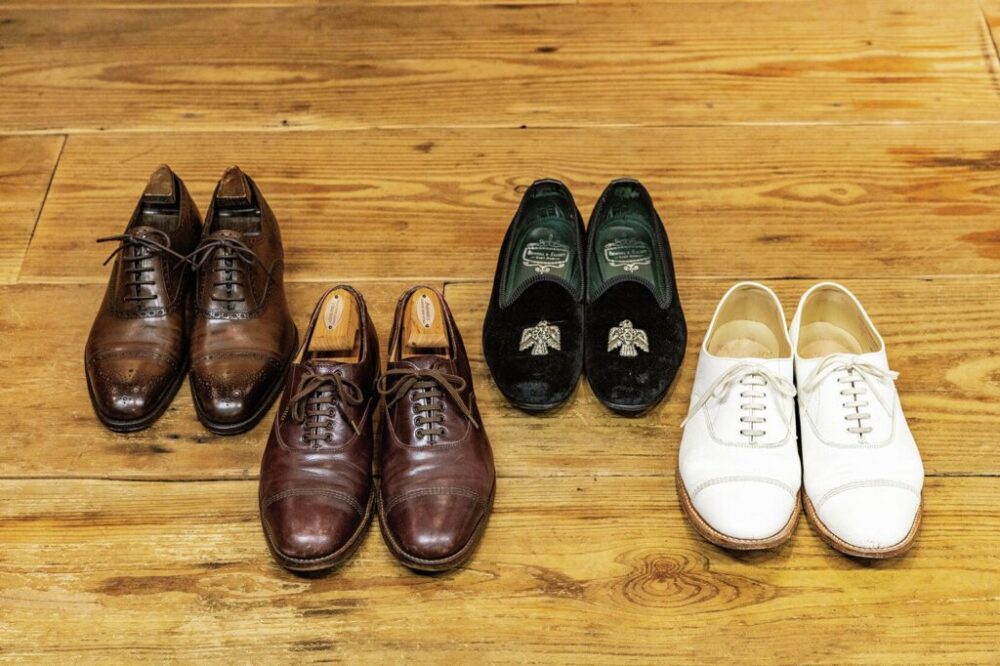 左から英国紳士靴の中でもトップクラスであるガジアーノ&ガーリングのウイングチップ。陰影のあるブラウンカラーがより高級感を増している。その隣と一番右のホワイトシューズは、ユニオンワークスがサンダースに別注したもの。特にホワイトのシューズは、気に入っていて、この中でももっとも登場回数が多いそう。正確に言うと革靴ではないが、ベルベットのスリッポンは、ブライスランズとボウヒル&エリオットのコラボだ。