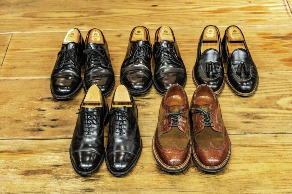 上の3足と右下は、アメリカを代表するシューズメーカーで、マサチューセッツ州ミドルボロウを拠点とするオールデン。左上とその隣は、今ではなかなか手にできないコードバンを使っている仕様。右下のスムースレザーとスウェードのコンビネーションは、アメリカのショップ別注。左下のドレッシーな内羽根のストレートチップは、アメリカの大統領も愛用したウィスコンシン州の名門アレンエドモンズ。ヴィンテージショップで購入。