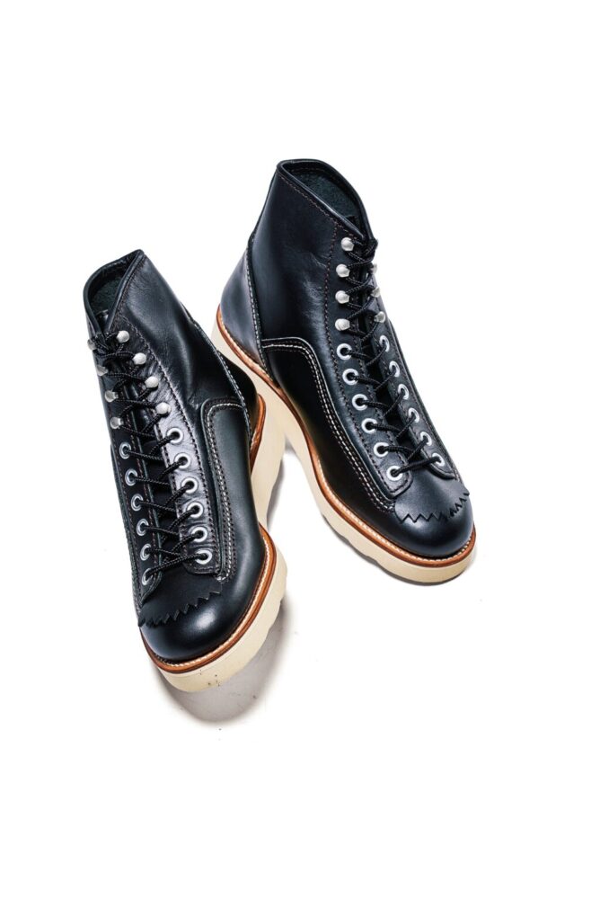 ロンウルフの最大の特徴は無骨なアメリカ製の部材を日本の職人の手により縫製していることで、このワッフルソールを装着した「ハンター」もアメリカ製オイルドカウハイドを使用。フックやアイレットなどのパーツもアメリカ製。履き口は足首の負担を軽減するためにパイピング仕様で、着脱しやすいようタン裏に革を張り込むなど革が二重構造になっている箇所が多く、通常のワークブーツに比べて約2倍の革を使用した贅沢な作りが特徴。5万1480円