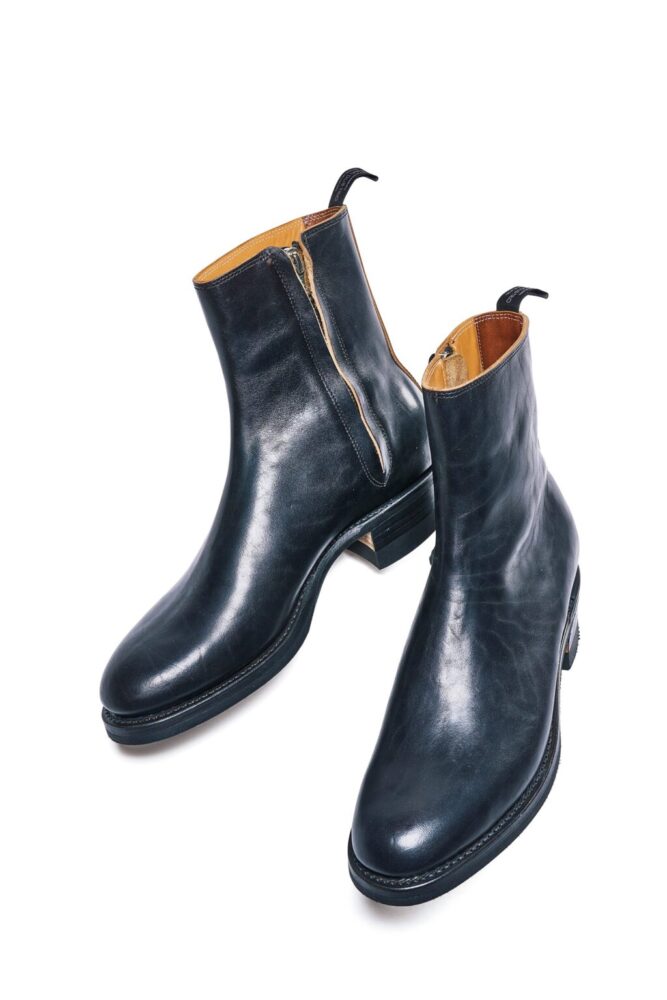 ナローなシルエットのクラシックウェスタン・サイドジップブーツ。甲部分と踵の包み込むようなフィット感で抜群の履き心地を実現している。様々な素材を用いて作られているが、こちらはキメの細かい国産ボックスカーフを採用。ソールは革底ではなく、耐久性、耐水性、歩行性も重視したビブラム社#269を採用。ヘビーデューティながらもシングルステッチに変更することで上品でドレッシーな佇まいに。ジップの引き手もオリジナル品。9万9000円