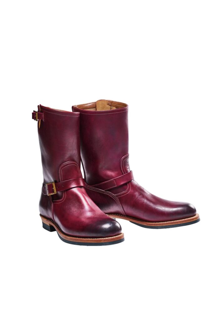 本池秀夫氏がディレクションを行う “MOTOR NEW VINTAGE” より、同氏が所有する1940年代頃のヴィンテージをベースに製作したドレスエンジニアブーツ。ヴィンテージに倣い、トゥは元から先芯を抜いた状態で、ドレスシューズのようにすっきりしたナローラストシルエット仕立て。素材はフルベジタブルタンニンなめしのホースバット。職人による手染めの染色で、履き込むことで染料の褪色によって浮かび上がる「斑茶芯」が楽しめる。9万9000円