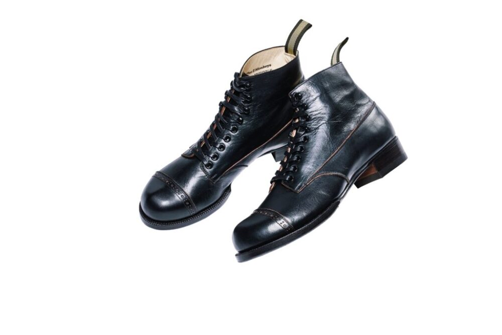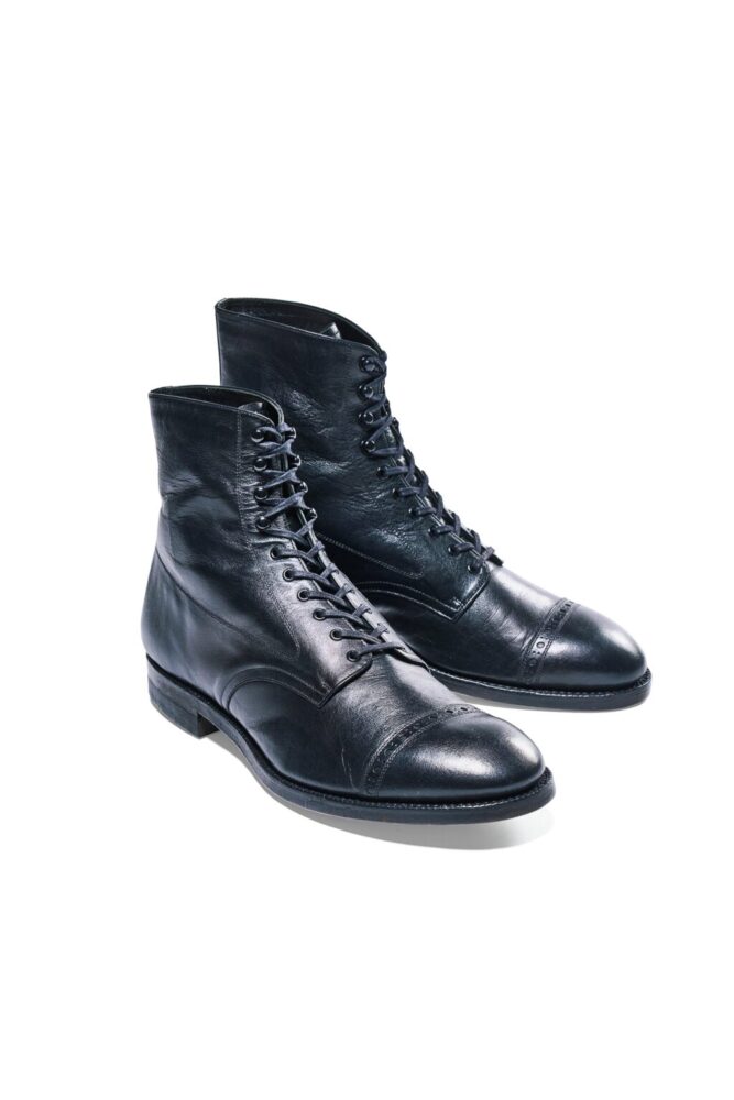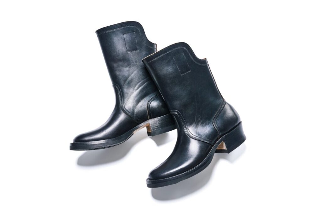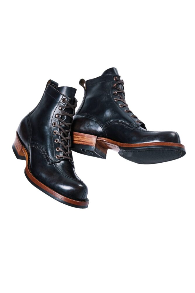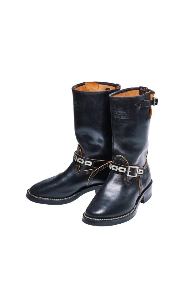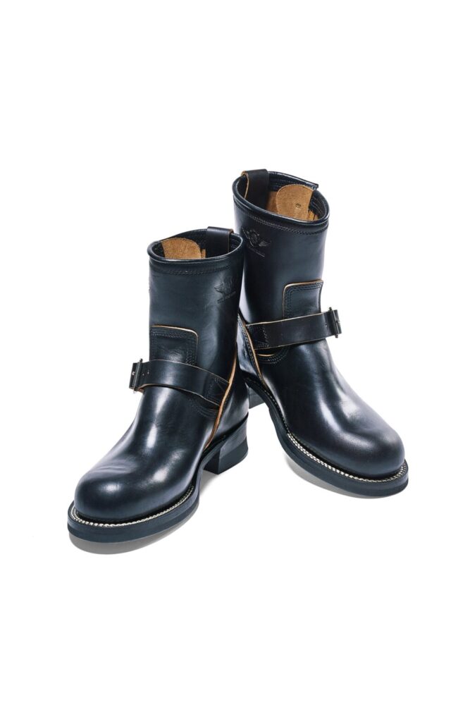 1940年代のヴィンテージをベースに、ベジタブルタンニンでなめし、染料と顔料で黒染めし、ロウに似たパラフィンで表面を処理したホースハイドで製作。履き込むことでツヤ感が増し、擦れた部分から茶芯が現れて、ヴィンテージ同様の経年変化が楽しめる。ソールはビブラム社#700を採用。無骨ななかにスッキリとした印象をプラス。シャフト部にブランドロゴが入るほかオリジナル鉄製バックルなど細部にまでこだわった作りとなっている。11 万8800円
