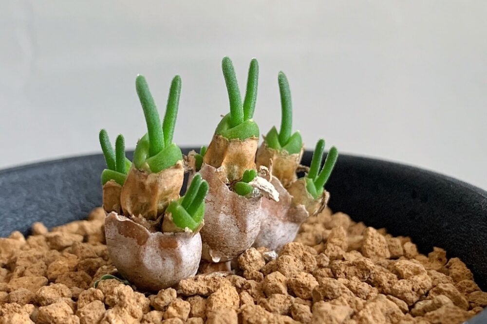 まるで三つ子のように並んだ、可愛らしい姿のモニラリア・オブコニカ。休眠から明けると、緑色の成長点から「うさ耳」のような葉を伸ばします。