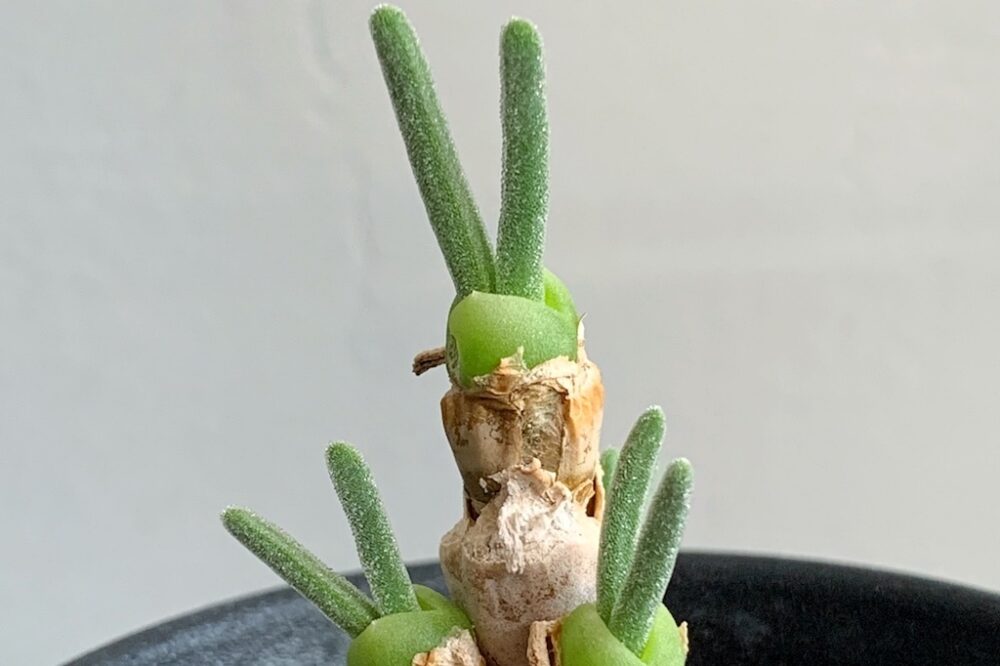 ウサギの耳のような可愛らしい形をした葉を伸ばすことで知られる、小型の塊根メセン「モニラリア」。