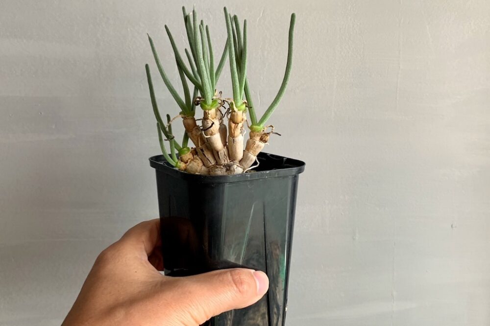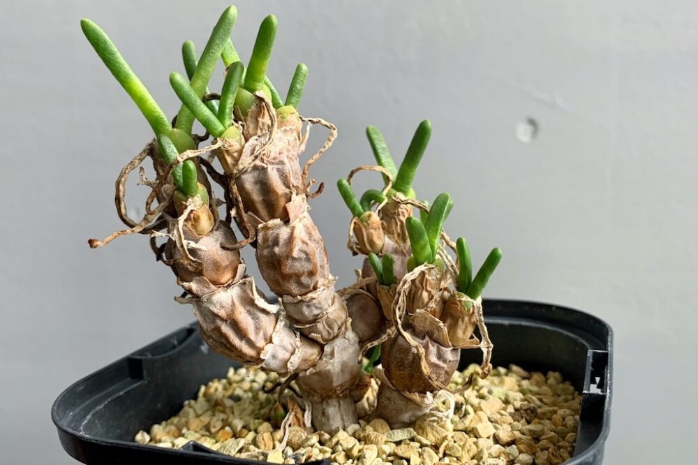 頭のような成長点は、1年で1個~2個程度しか増えないため、大きな群生株に育つまでは非常に長い年月を要します。こちらのモニラリア・モニリフォルミスは、数珠繋ぎに縦に伸びながら塊根部が横にも増え始めているのがわかります。 参考価格9350円
