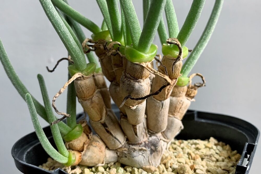 葉と成長点は緑色をしていますが、それ以外の部分は表面が薄茶色の表皮に覆われて塊根部を形成しています。