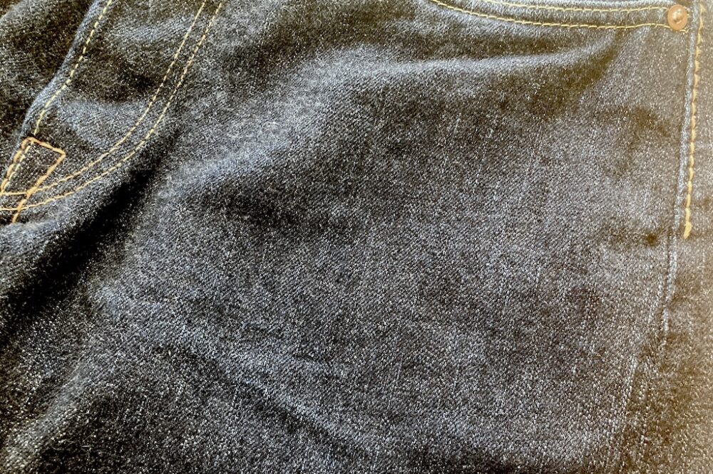 そのジーンズの表情にも直結する腿正面にはうっすらとタテに走る色落ちが。生地をかなり近くから見ないとまだわからない程度ではあるけれど、タテ落ちがここから始まりそう。さらに腿の正面内側にはヒゲ(ヒゲ状に走る色落ち)に成長しそうな生地感になってきた。生地の毛羽立ちも少し残っているので、まだまだ新品のジーンズ感はぬぐえない。