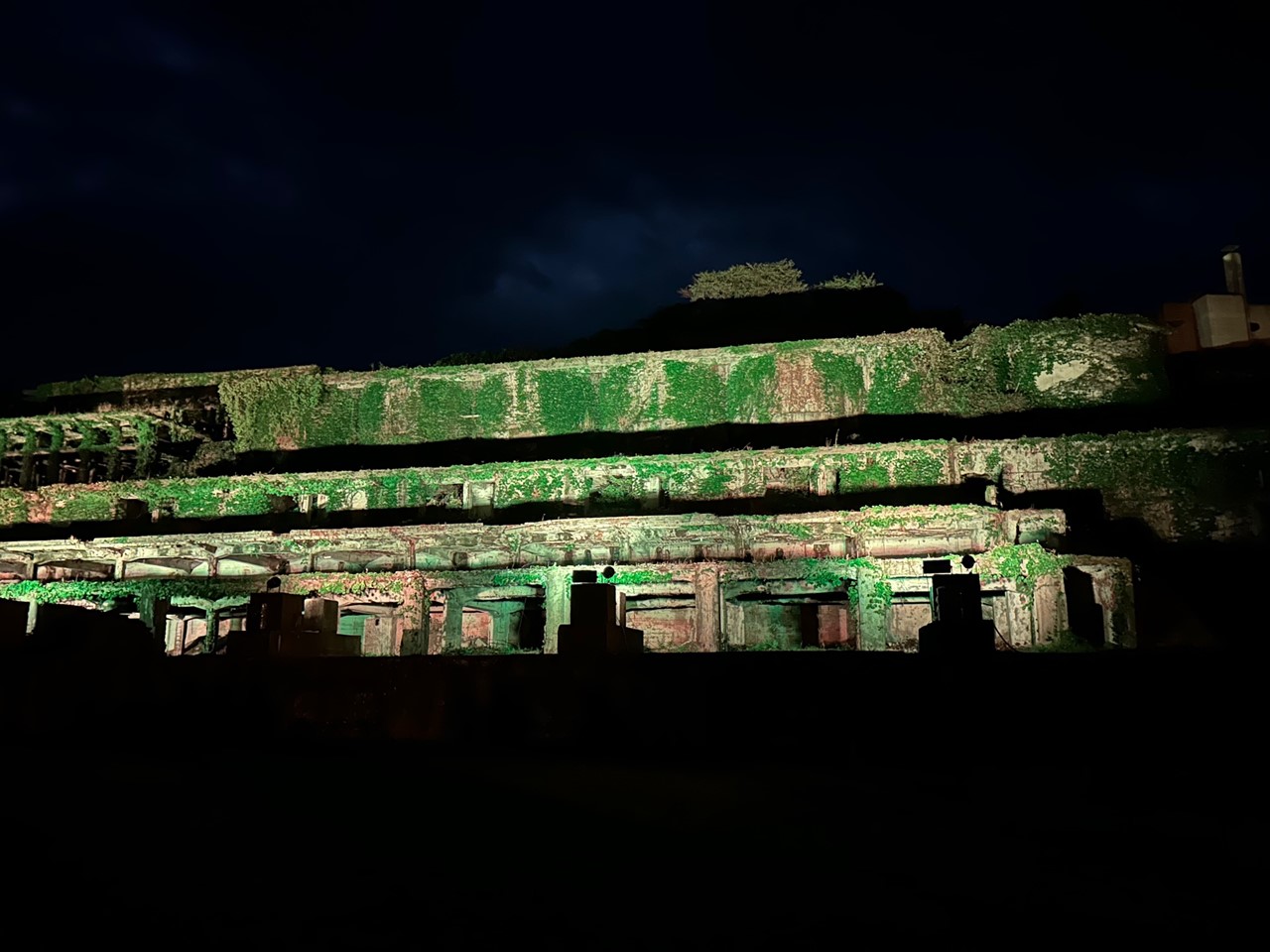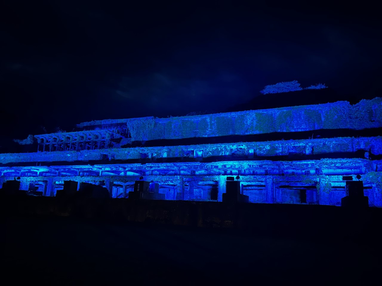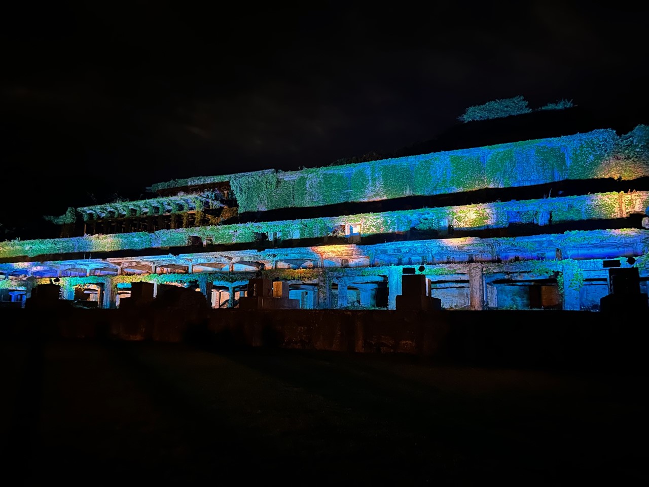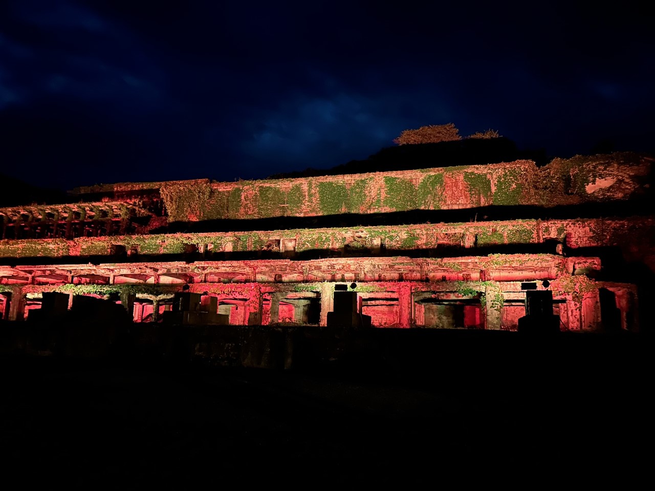 現在は大きな階段状のコンクリートの建物のみが残り、そのコンクリートもよく見ると崩れているところもちらほら。そこに鮮やかな緑のツタが建物を覆い、晴れた日には青い空とのコントラストが美しい。まるでラピュタのような幻想的な風景を作り出し、“映えるスポット”としていま注目されている。夜にはライトアップされより神秘的な姿に。特別なものは何もないけれど、今の日本につながる技術の跡にロマンを感じる。