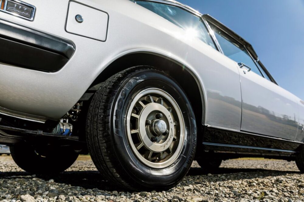 117クーペは`68年から`81年まで製造され続けたロングセラーモデルで、大きく分けて3期に分けることができる。ジウジアーロのデザインを忠実に再現すべく、一部ハンドメイドで少数を生産された通称「ハンドメイド」の第1期、GMとの提携後に量産モデルとなった「丸目」の第2期、そしてヘッドライトが角目四灯に変更となった通称「角目」の第3期だ。