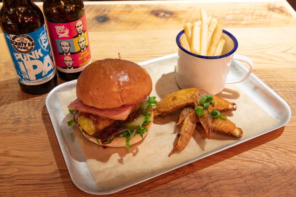 場所柄、海外からの観光客も多く訪れ、国際色豊かな客層が特徴。フードメニューもハンバーガーやピザなどが人気で、とにかくボリュームたっぷり。濃厚な味わいで、ビールがぐいぐい進むのもいい。またブリュードッグのレアなボトルをソース入れにするなど、直営店ならではのディテールにも注目だ。スコットランドの空気を感じながら、地元のビールを堪能したい。