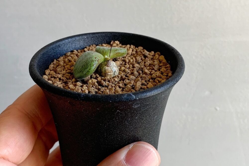 塊根植物でありながら、塊根よりも葉が目立つ珍奇種「チレコドン・シングラリス」。画像の個体は、まだ芽吹き始めたばかりなので葉の直径も1.5㎝程度ですが生育期には用土の表面を覆うように、葉はぐんぐん大きくなります。