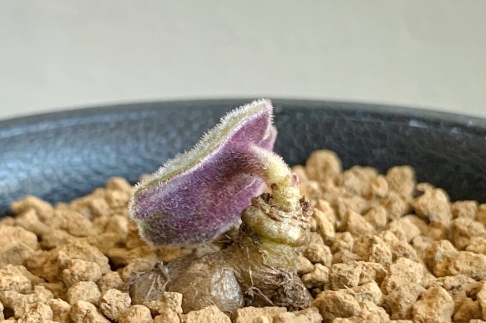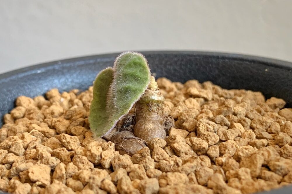 生育期に展開する多肉質な葉が特徴的で、表面には赤い斑点模様が浮かび細かな微毛に覆われています。塊根部は最大でも5㎝以下ぐらいにしか成長しない品種です。