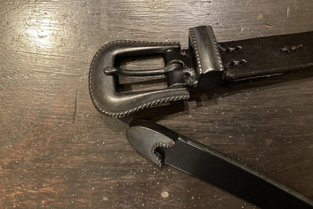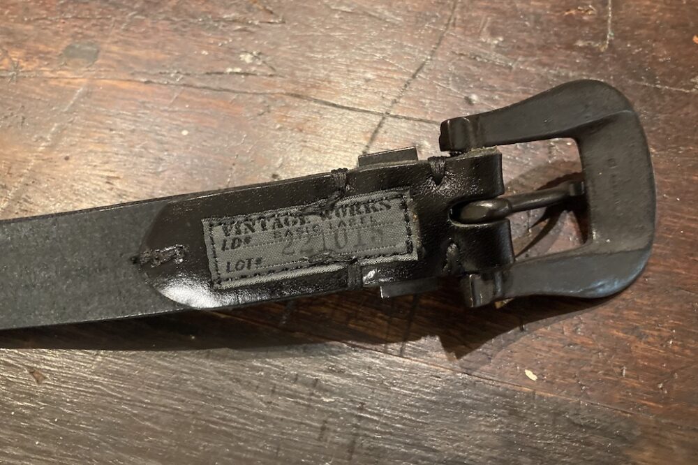 で、やってきたこのモデル。なんとも新鮮なのはレザーだけでなくバックルも漆黒。いつものヴィンテージワークスとひと味違うと思ったら、なんとこれは一般的なベルトと同じように裁断前に革を染色し、その後に裁断、あえて経年変化が少ないように仕上げた裏メニュー的なモデルであった。