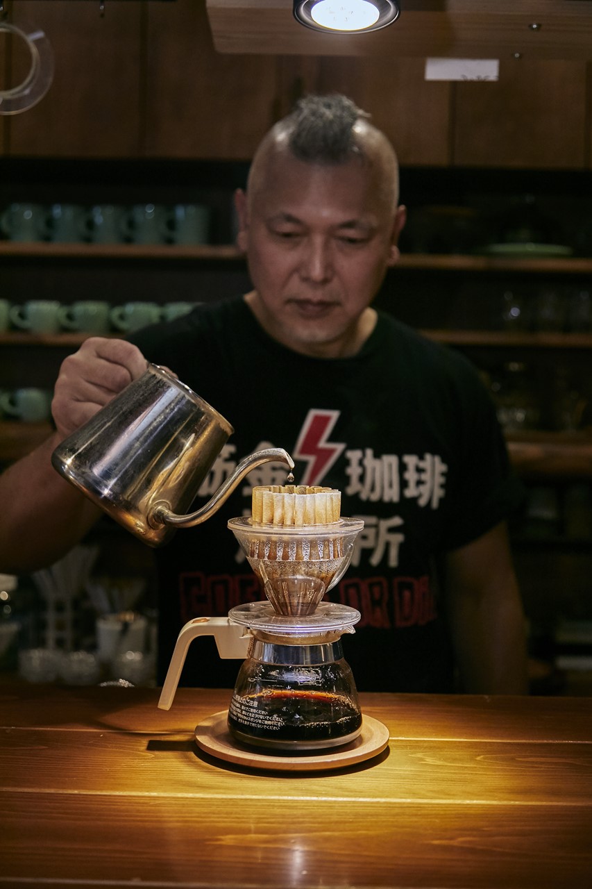 研究熱心な性格が功を奏してオリジナルグッズの開発にも成功している。「筋金式・旨味抽出バーチカルブースター」というドリッパーの補助器具で、誰でも簡単に〝旨味の濃いコーヒー〞が抽出できる。焙煎は自分の好きな深煎りしか行わない。ロースターに機械などは接続せず、自分の感性で焙煎する。デジタルに頼らない姿勢が人気のヒケツかもしれない。