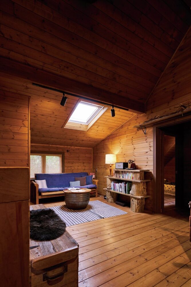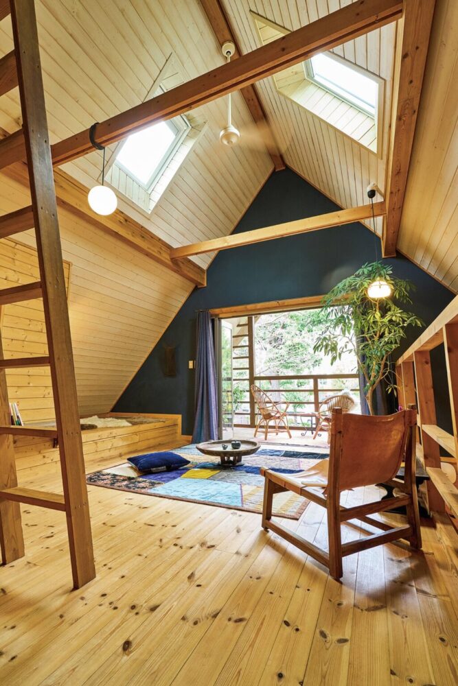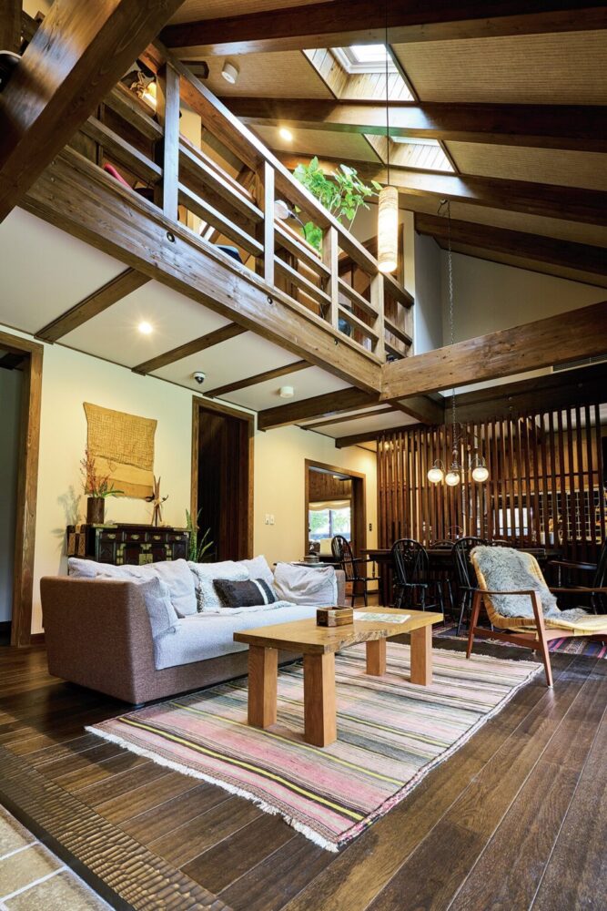 アメリカの片田舎に建つようなログハウスを彷彿させるカントリーログ。皆が思い浮かべる、“いわゆるな”ログハウス然とした佇まいが魅力だ。室内の写真は2階部分。階段を上がると仕切りのない空間が広がり、吹き抜けを通して1階も見渡すことができるのだ。