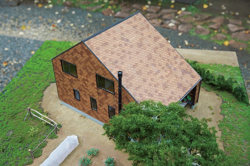 今までのBESSのモデルとは一味違った外観をもつ「間貫けのハコ」。まず目に入るのが、愛嬌のあるハコのようなカタチと、ウロコのような屋根と壁。実はこの壁、アルマジロをモチーフにしているというから面白い。正面には縁側があり、一息つける「間」を感じる。何気なく家族が集まれるような人と人をつなぐ空間となっている。三角屋根のおかげで天井も高く開放感に溢れ、仕切りも少ないために“貫け”感も感じられる。おおらかにゆったり暮らせるハコ、それが「間貫けのハコ」なのだ。