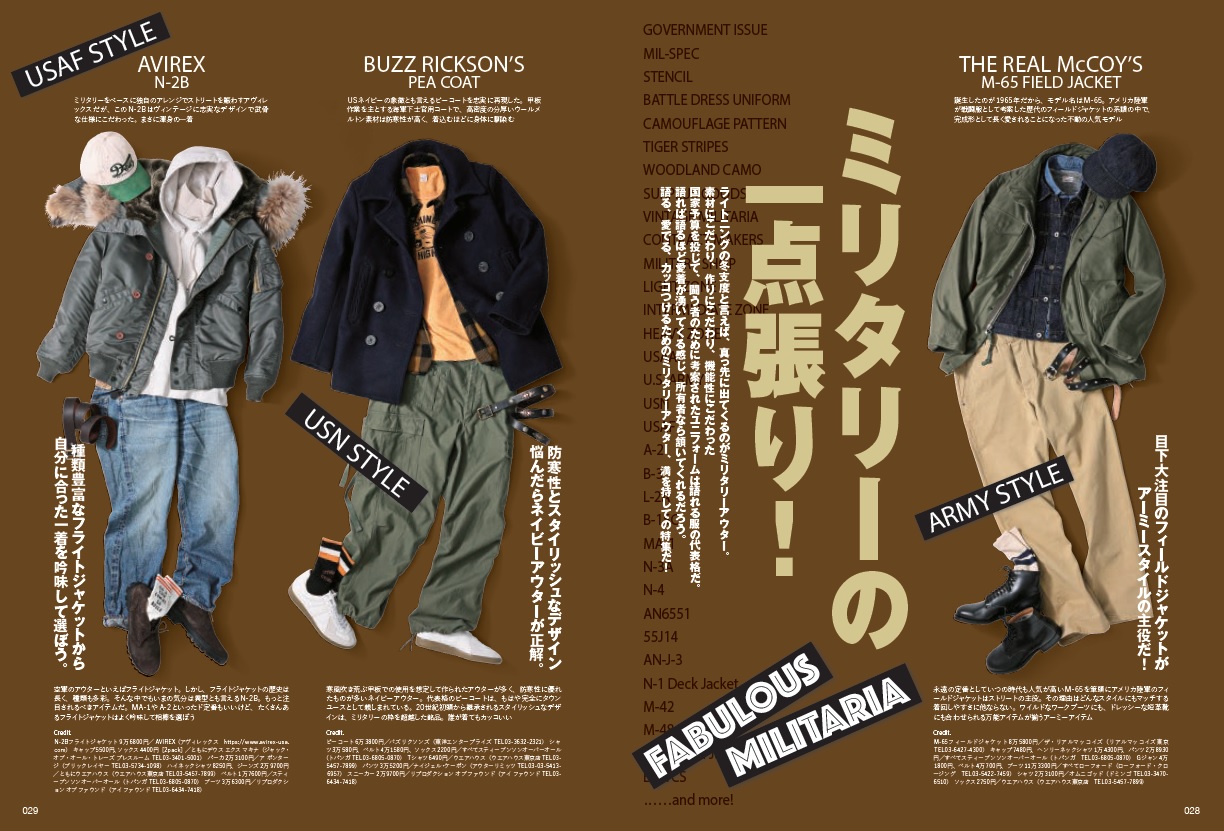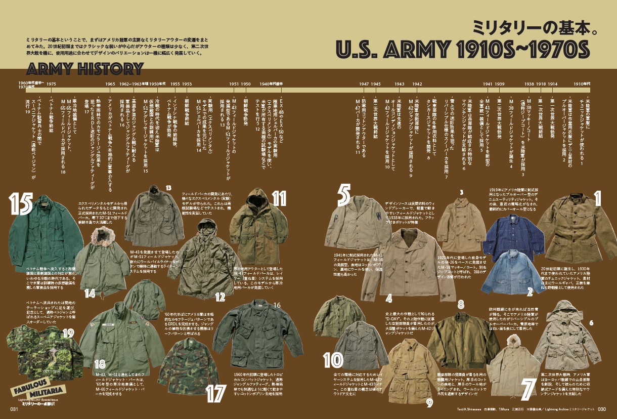 まずはミリタリージャケットの変遷のお勉強。1910年代から’70年代の主な戦争の歴史や出来事とそれに伴い開発されたジャケットを解説している。自分が持っているミリタリージャケットがどの時代に作られたのか、よくわかるぞ!