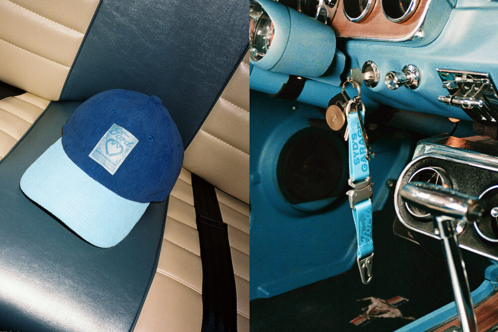 SYD’Sガレージとフォードのロゴが入ったキーチェーンは女性にもおすすめのベイビーブルーがベースカラー。キャップはあえてコーデュロイを使ったクラシックなスタイルをポップなカラーでアレンジしている。キャップは34ドル99、キーチェーンは14ドル99