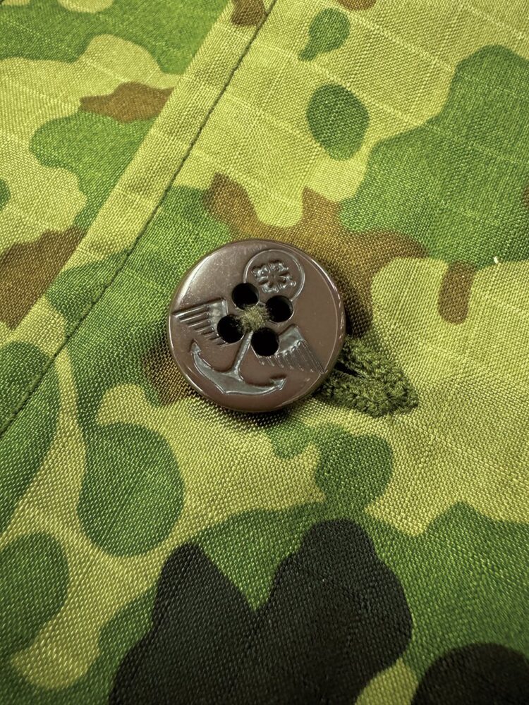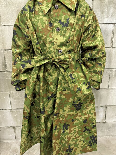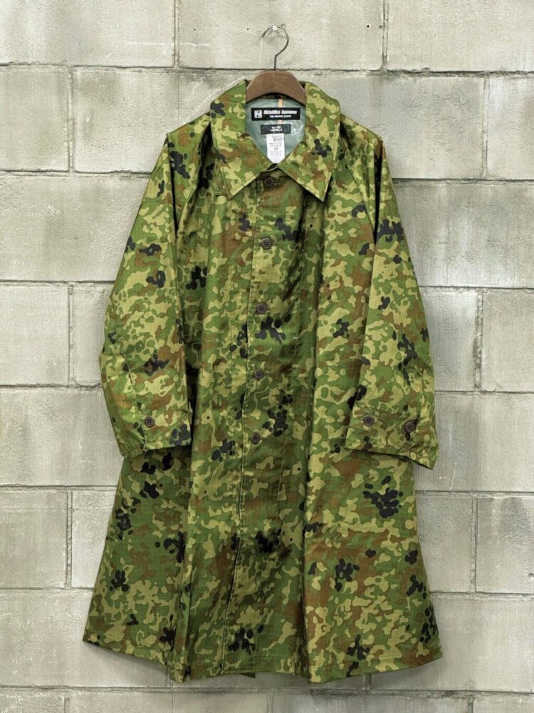 このカモフラージュ、某国のセルフディフェンスフォースが採用しているパターン。柄を模しているというワケではなく、ナイロンの生地自体がモノホンなので撥水性があり、レインコートとして活用できる。コート自体はブリティッシュヴィンテージのデザインを踏襲しているシルエット。決して野戦用の雨具には見えない、ジェントルなカッコよさを持つ。