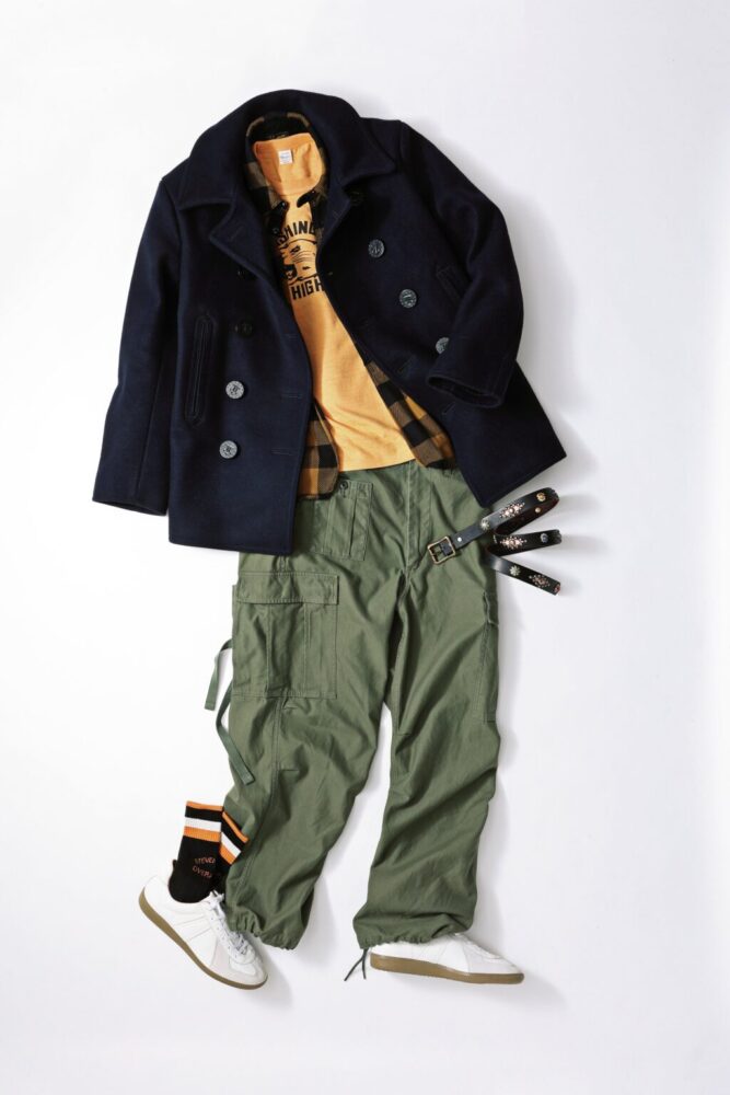 寒風吹き荒ぶ甲板での使用を想定して作られたアウターが多く、防寒性に優れたものが多いネイビーアウター。代表格のピーコートは、もはや完全にタウンユースとして親しまれている。20世紀初頭から継承されるスタイリッシュなデザインは、ミリタリーの枠を超越した銘品。誰が着てもカッコいい。