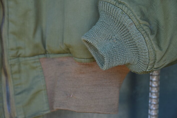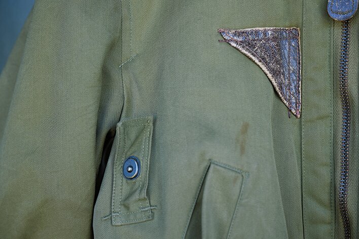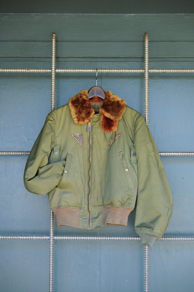 後に、MA-1となるB-15シリーズの中のB-15A。最後のコットン製で、酸素マスクのホースを固定する革タブが特徴的なディテール。左袖のリブだけ異なっているがそれもご愛嬌。ダメージが少なく、最高のコンディションと言える。28万円