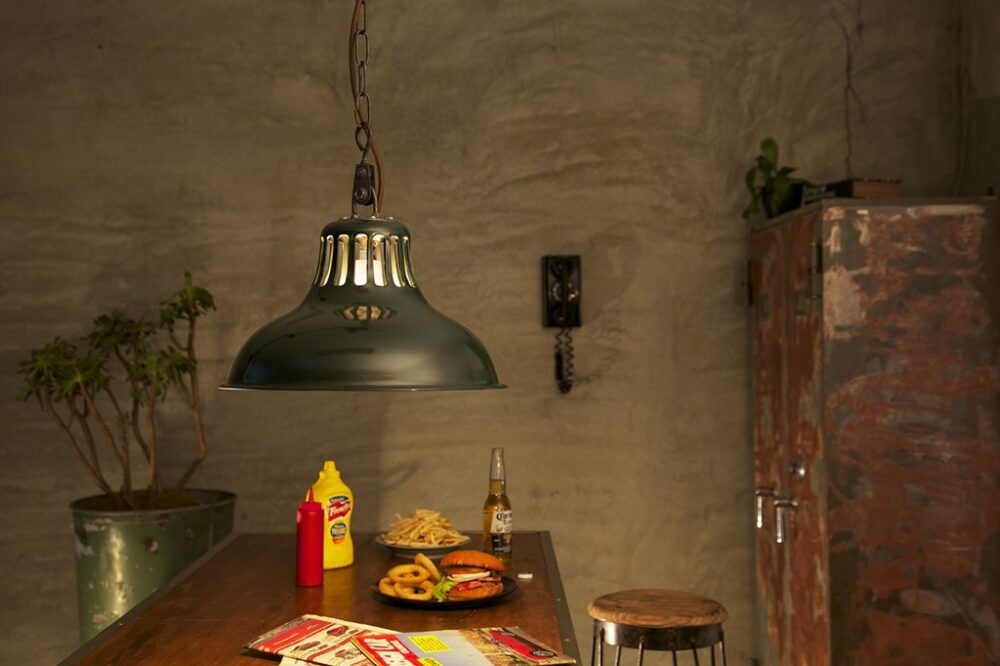 ウエアハウスにあるようなボリューム感のある重厚な作業用ライトをイメージ。シックなカラーリングでガレージやリビングなど場所を選ばないのもいい。アイアンのスツールとも相性抜群。2万4200円