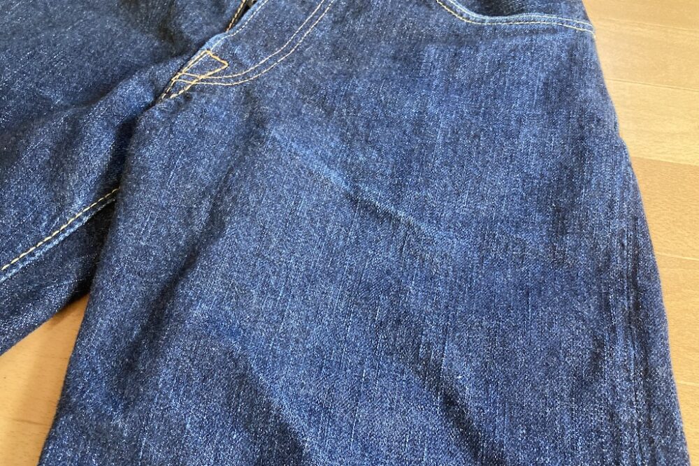 シルエットはクラシカルなスタイルをイメージしたゆったりとしたストレートなので、バリバリのヒゲは出ないと思うけど、生地の凹凸が激しいスラブ感のあるデニムはピュアブルージャパンならではの色落ちが期待できる。