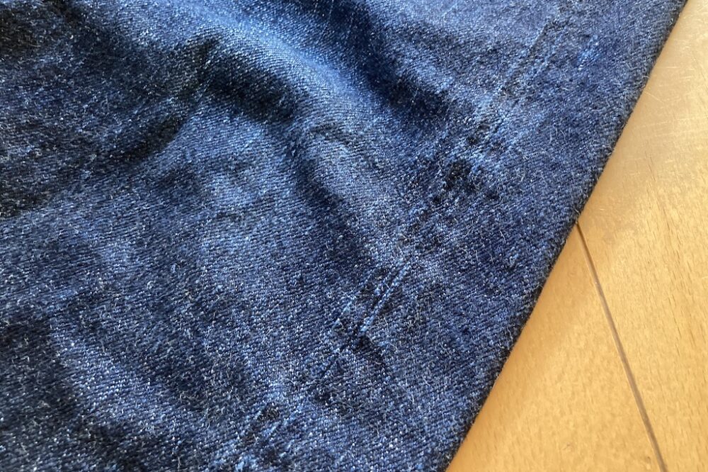 もともと凸凹としてスラブ感のある生地だったけど、その凸凹感に合わせるように白い点がタテに連なって見える、いわゆるタテ落ち感が出てきた。さらに内腿部分にはヒゲ落ちもわかるようになってきた。洗濯したことで生地がまたキュッと縮んでよりわかりやすくなったのか。いずれにしてもタテ落ち始まりました。うれしいぞ。