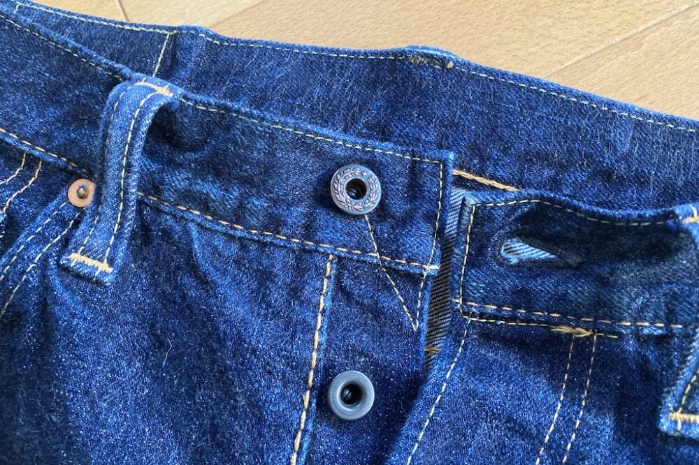 普段ベルトをして穿いていることもあって、フロントのトップボタンは塗装が落ち、銅の色が見えてきた。月桂樹の部分に注目。もう完全にボタンの凸部分の模様は銅の地肌になっている。こういうパーツの経年変化も楽しい。