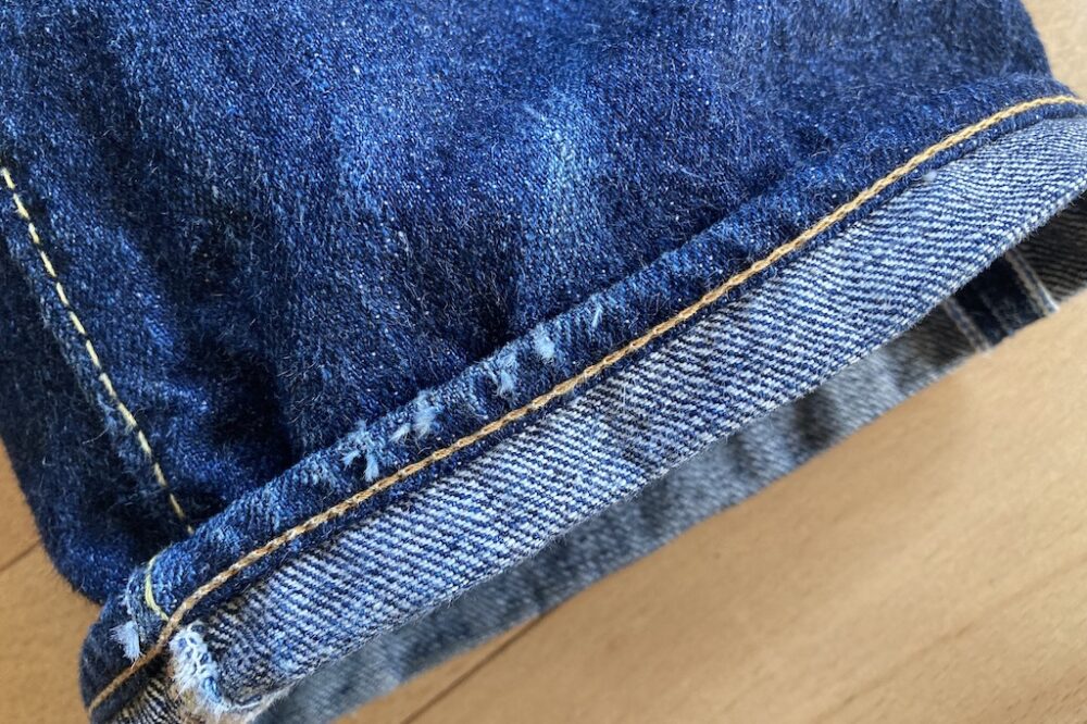 チェーンステッチで裾上げして激しくパッカリングが出ていた部分は、シューズでこすれるのか、早くもダメージが出てきた。くるぶし部分もぼんやりと色落ちがしていて表情豊かになってきている。ここもこれからの色落ちが楽しみな部分。
