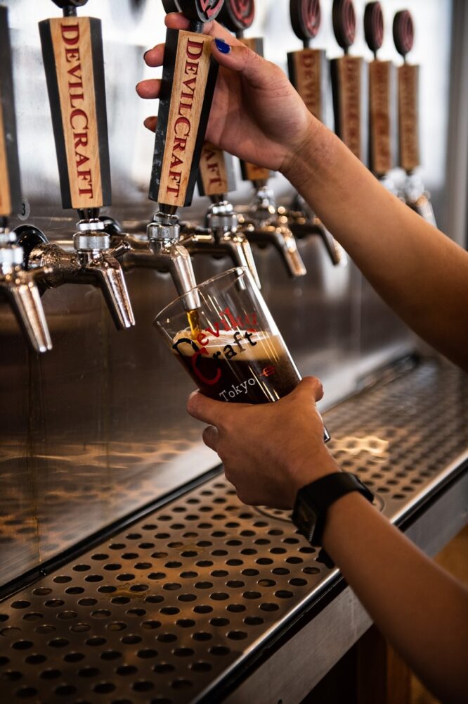 「週に数日、スモールバッチといわれる(少ない仕込み量)で、常設の定番品はあえて設けず、そのほとんどが限定ビールでさまざまなスタイルのビールを作っています。伝統的な製法と原材料を使用し、無濾過で仕上げるのがデビルクラフトの流儀。また、旬なフルーツやその他の珍しい材料を使用したり、新しいビール開発も日々行われています。そのため、店内では常時10種以上のオリジナルビールが楽しむことができます」