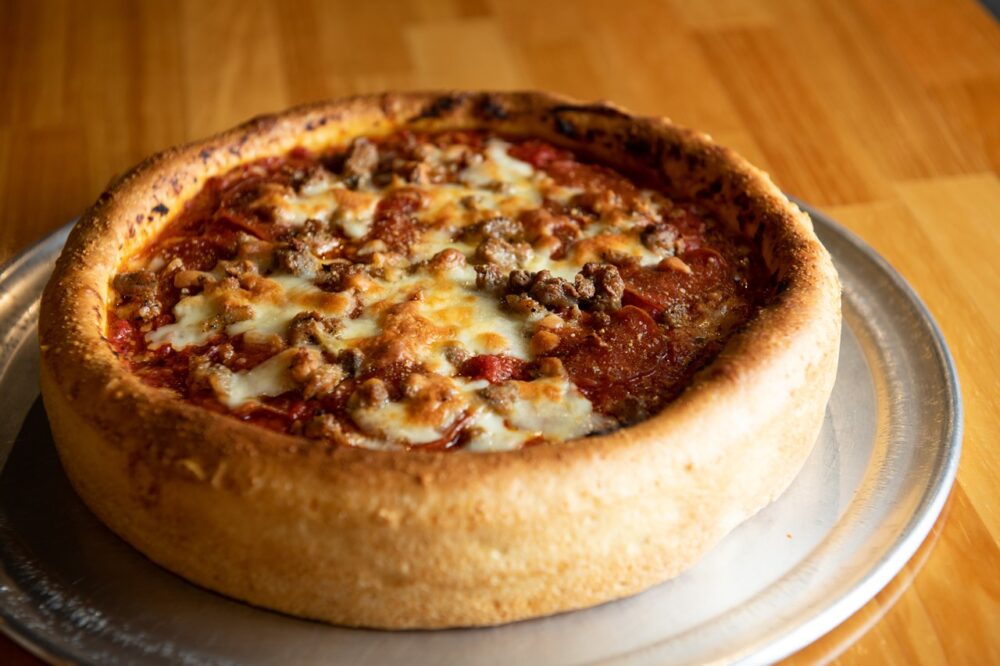 デビルクラフトの名物料理として愛されているシカゴピザ。肉厚でボリューミーなピザは大人4人でも充分な量であるほど満足感が高い。そのほかチキンウィングなども人気メニュー。