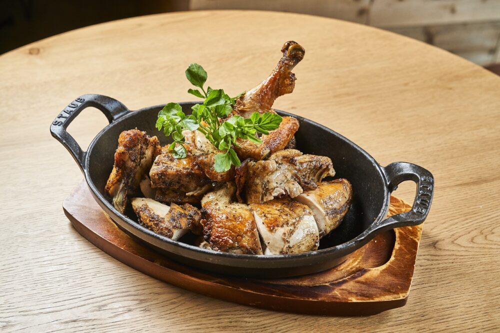 沖縄の岩塩とハーブでマリネし、外側はパリッと、中はジューシーに焼き上げた一品。