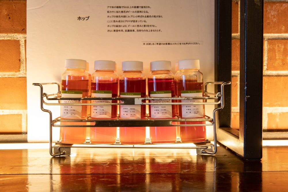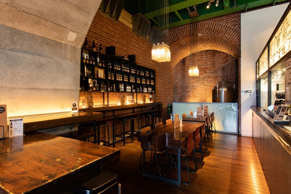 「常陸野ブルーイング・ラボ」は、旧万世橋駅の高架下に作られた、レンガ造りの趣のある直営店。重厚感のあるビールタンクが店の入り口に鎮座。海外の映画に出てきそうな駅を彷彿させる内装に、ビール製造に使われるホップや小麦、試験管などが展示されている。