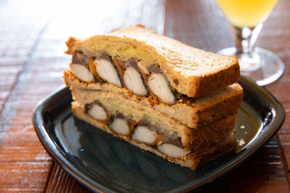 国産の肉厚なサバをオリジナルビネガーでマリネした「常陸野さばサンド」。心地よい酸味と旨みがヤミツキになること請け合い。見た目のボリュームはあるが、女性でも一皿サラリと食べられる。