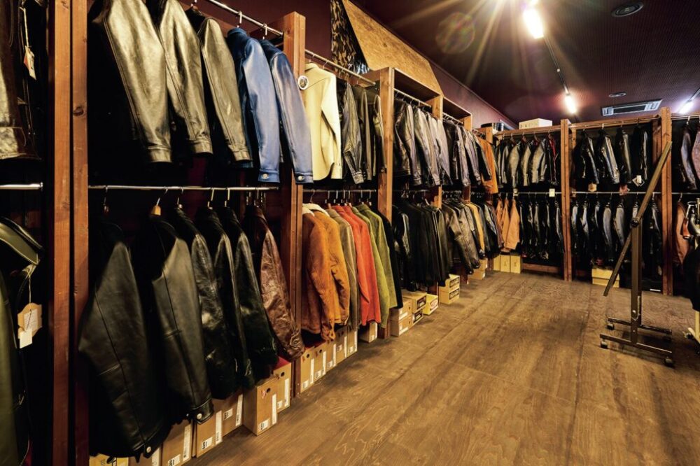 見よ! この革ジャン回廊を。ファインクリークレザーズやY’2レザー、レインボーカントリーやリアルマッコイズなど、人気ブランドの革ジャンが常時400着以上並ぶ。こんなショップ、見たことある?